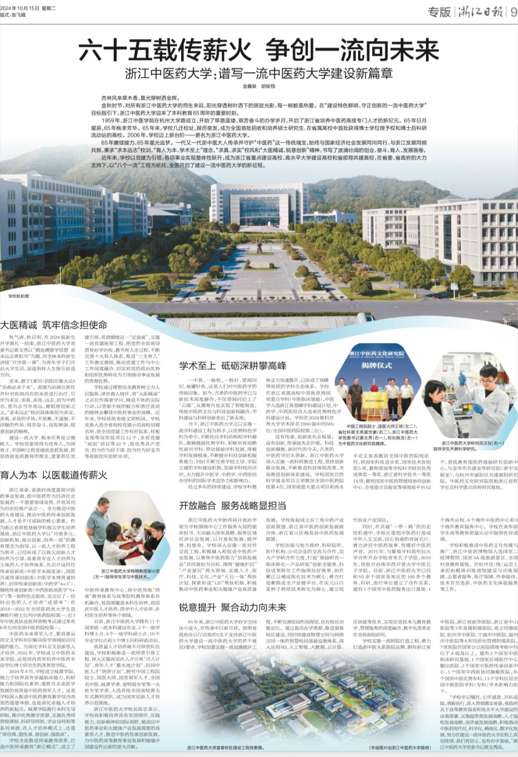 近年来,学校以党建为引领,各项事业实现整体性跃升,成为浙江省重点建设高校、高水平大学建设高校和省部局共建高校,在省委、省政府的大力支持下,以“八个一流”工程为依托,全面开启了建设一流中医药大学的新征程。