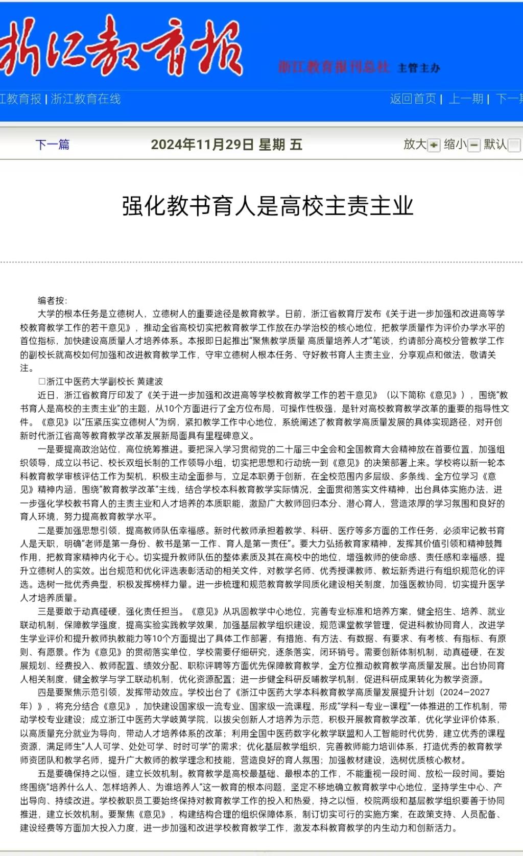 大学的根本任务是立德树人,立德树人的重要途径是教育教学。日前,浙江省教育厅发布《关于进一步加强和改进高等学校教育教学工作的若干意见》,推动全省高校切实把教育教学工作放在办学治校的核心地位,把教学质量作为评价办学水平的首位指标,加快建设高质量人才培养体系。本报即日起推出“聚焦教学质量 高质量培养人才”笔谈,约请部分高校分管教学工作的副校长就高校如何加强和改进教育教学工作,守牢立德树人根本任务、守好教书育人主责主业,分享观点和做法,敬请关注。