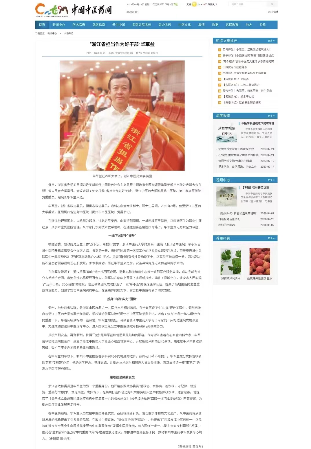 中国中医药报、中国中医药网:“浙江省担当作为好干部”华军益