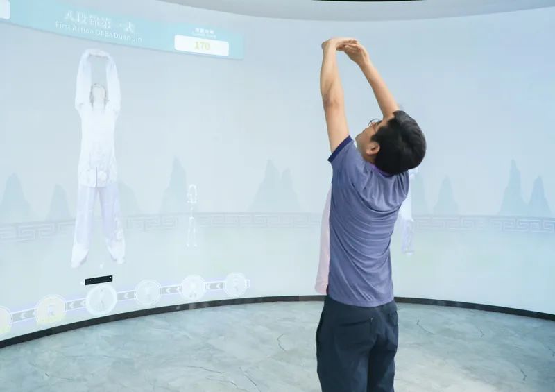 在当代,八段锦也深受群众喜爱。为了更好地推广中医养生文化,促进群众体育发展,浙江中医药博物馆邀请国家一级运动员、健身气功国家级裁判员、久久精品一区二区三区四区体育部蔡瑾瑾老师携其弟子录制了一套八段锦教学视频,并以此为基础制作了八段锦演练评分系统。参观者在体验馆中半圆形的场地中,可以跟随视频学习每个动作,系统会对动作的完成程度,即时给予表扬或鼓励。此外,体验馆还定时请指导老师到馆中面对面带教。