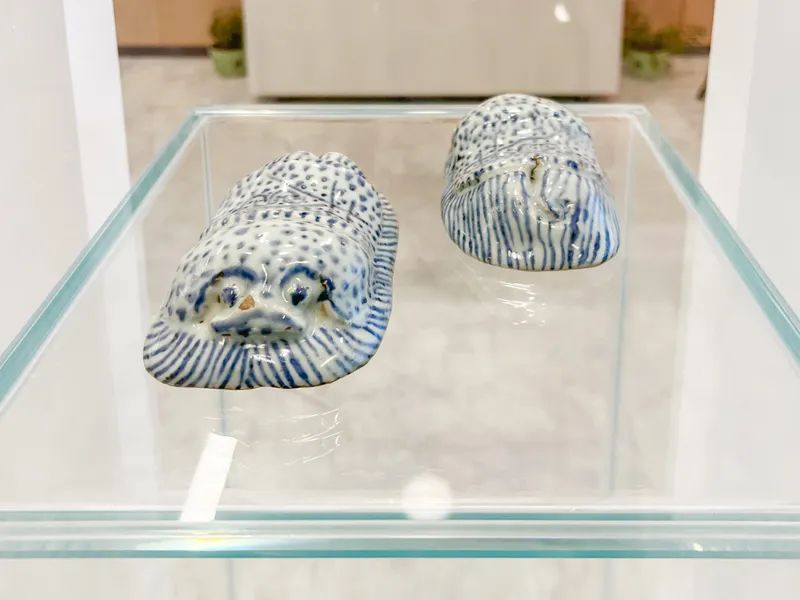 一组是两具小巧的青花瓷脉枕。青花是明清时期流行的瓷器品种。这两个脉枕约长15厘米,宽9厘米,最高处约高2.5厘米。一端为虎头形状,背上驮着一片瓦,中间稍凹,供患者搁手臂诊脉用。虎身为波形青花纹,瓦面为青花“寿”字纹和散点纹。诊脉是中医四诊之一,脉枕是诊疗中不可缺少的工具。观赏这两具青花瓷脉枕,人们仿佛看到了老中医凝神诊脉、妙手回春的场景。