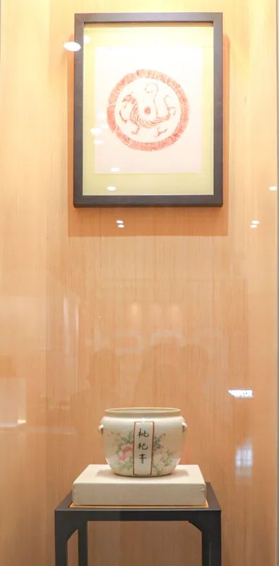正门的4个橱窗展柜中,各展示了一张四灵拓片和一个粉彩药罐。“四灵”,即青龙、白虎、朱雀、玄武,是中国古代神话中掌东西南北四方之神,同时也是四方、四季的象征。拓片源自汉代瓦当,朱砂拓印,古朴灵动,展示了我国优秀的雕塑艺术。每张拓片下面均有一个小展台,各展出一个精美的粉彩文字药罐,罐身文字均是药名,正好与四灵相对应: