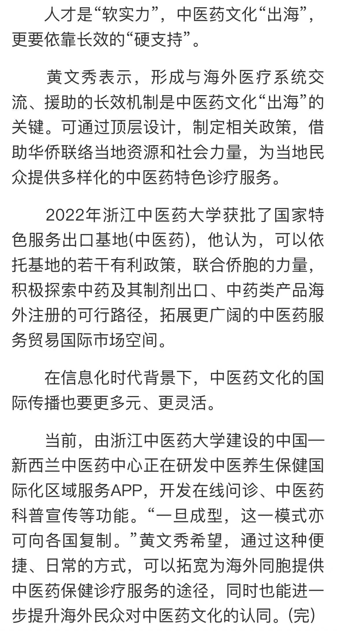 他认为,要借侨力助推中医药文化国际传播,在进一步提升海外民众对中医药文化认同的同时,也可以拓宽为海外同胞提供中医药保健诊疗服务的途径。